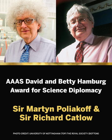 The award is given to an individual or a small group working together in the scientific, engineering or foreign affairs communities making an outstanding contribution to furthering science diplomacy.  The American Association for the Advancement of Science (AAAS) recognised their efforts to bring communities together over many years including those they served as  Royal Society Foreign Secretaries resulting in collaborations between British, U. S, European, South African and North Korean scientists.